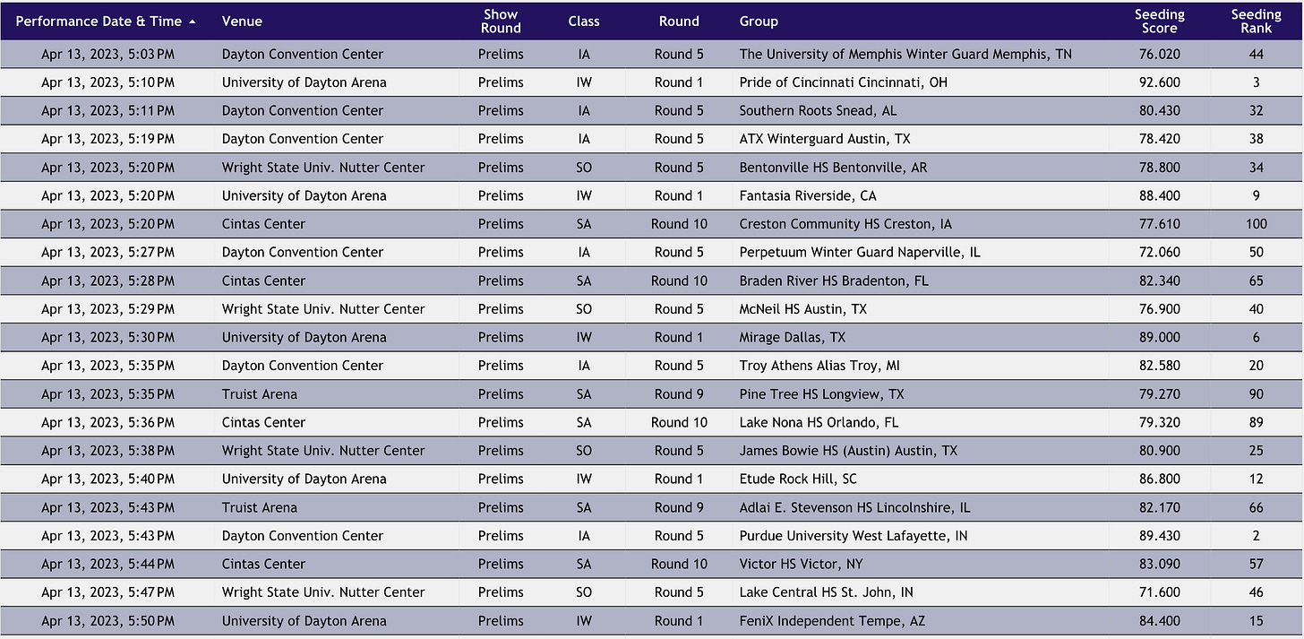 Will you follow the action from home all weekend via live streams on FloMarching? Check out our master schedule, which we’ve published as part of our 2023 WGI Dashboard. The default view shows all performances in chronological order to help list every group performing at each venue at any given time. The table can also be filtered by day, class, venue, or show round by using the drop-down filters on the top of the page. Lastly, the table includes the seeding scores and rankings each group received earlier in the season at WGI Regionals. Unfamiliar with how seedings work? Check out this piece we published earlier this week: a deep dive into the whole process.