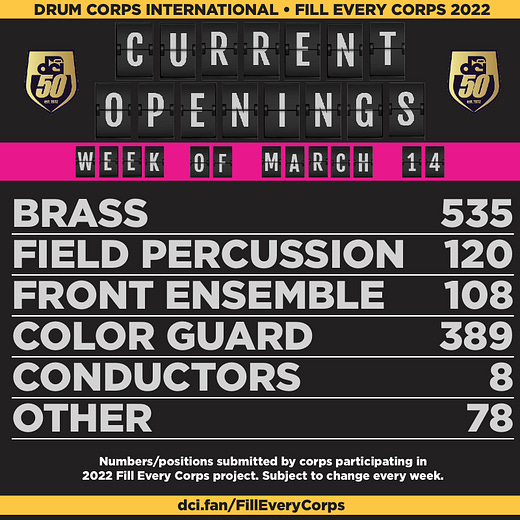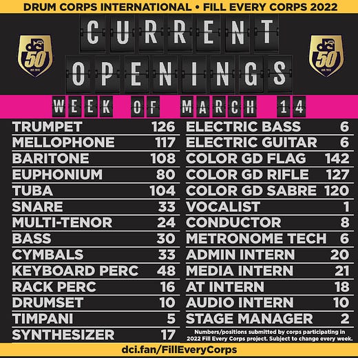 The corps that consistently place below 16th or so at championships? That’s a whole separate ballgame, recruitment wise. There’s significant worry with the traditionally regional recruitment of these corps. Largely, these groups have generally foregone the national auditions that a lot of the higher placing corps have done in favor of more localized and regional audition camps. Sources at multiple corps that rely on this have reported issues with attendance, mostly due to how much COVID has disrupted high school bands, DCI’s strongest feeder over the past few decades. In addition, another way these corps have gotten their members have been cut lists from larger corps. The concern here is that a lot of the members they’d traditionally get off of the cut lists of higher placed corps aren’t getting cut anymore due to more spots available per corps as well as a smaller prospective field of active, engaged, and experienced high school band kids. When you combine that with the issues of local recruiting, these factors have made recruiting for the regional corps difficult in a way that the perennial World finalists don’t have to deal with. As of mid-May, the majority of Open Class corps were said to be hopeful to reach half of the maximum corps size. Corps that were medaling in previous years in Open are now struggling to reach 100 members.