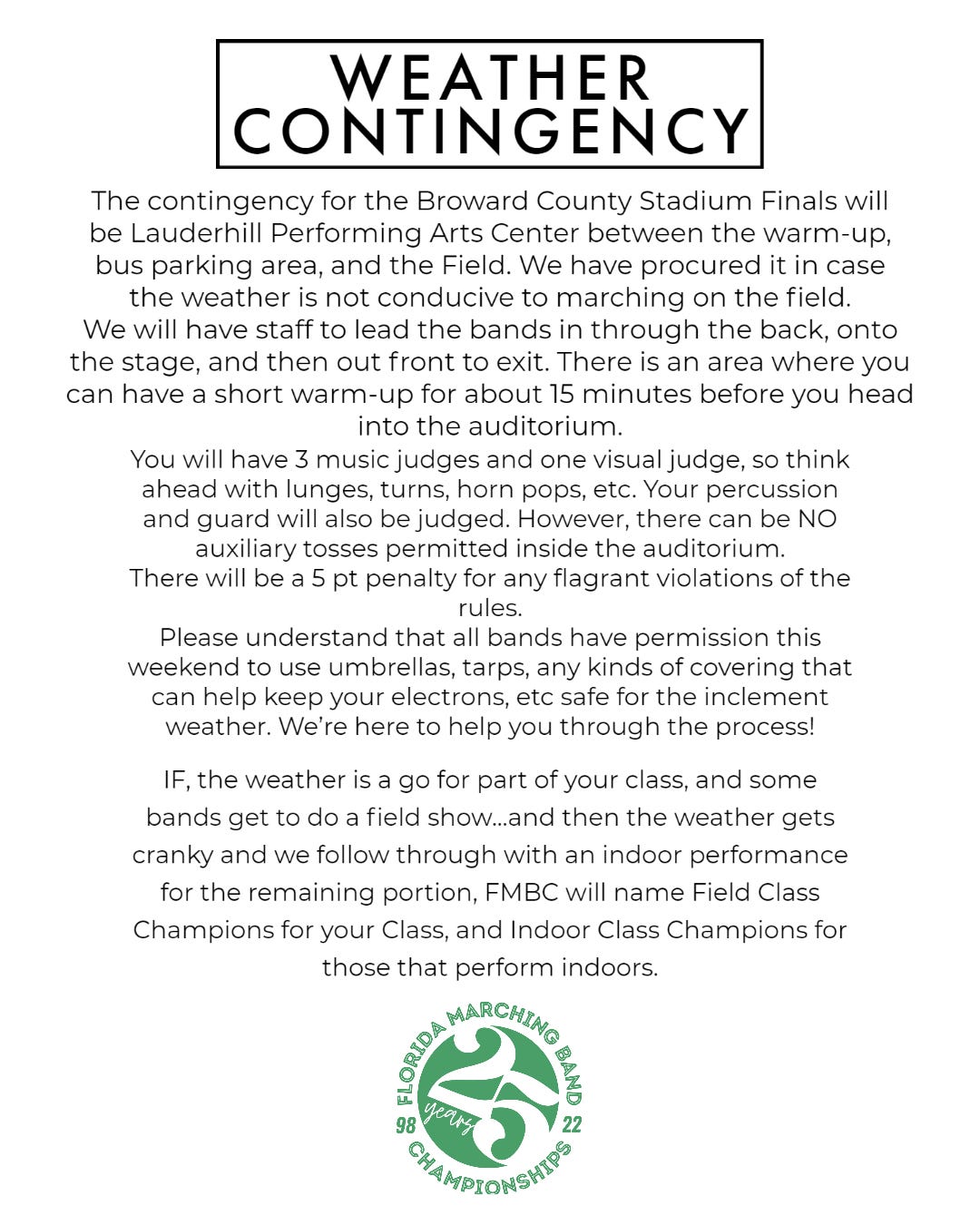 Finals are scheduled to take place at Broward County Stadium, with 3A performing starting at 5:30 pm, a dinner break, and then Traditional/Show Band and 2A, with the evening’s exhibition being Florida Memorial University. However, there is a possibility that this event will be moved inside due to forecasted rain.