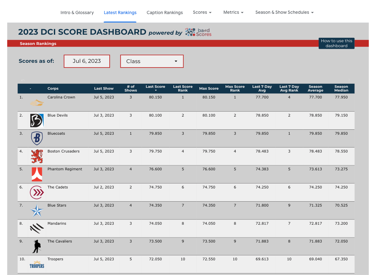 Scores! Numbers! Data! The newest resource for viewing all of the scores and numbers behind the 2023 DCI season