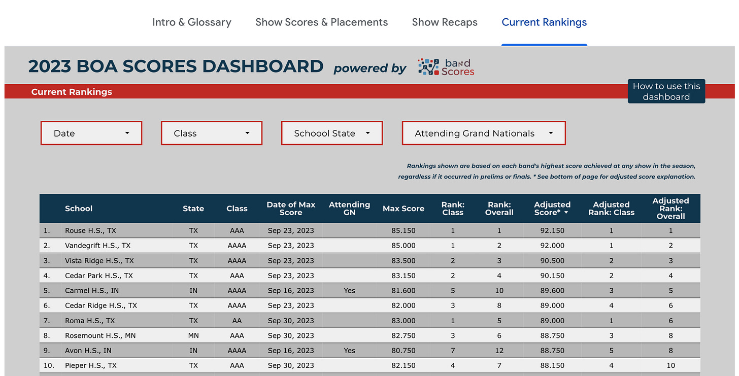 Another cool feature to check out is the “Current Rankings” page. This page lists every band that has competed at a Bands of America event so far in the 2023 season and ranks them by highest score, regardless of round or date. Although scores are not necessarily comparative between shows, this page is a fun view to see how bands have been scoring throughout the season. Additionally, a column indicates if a band will be participating at BOA Grand Nationals in November, as well as an “adjusted score” column. Adjusted scores are calculated to compare scores more evenly by adding points based on when a band’s highest score falls in the season.