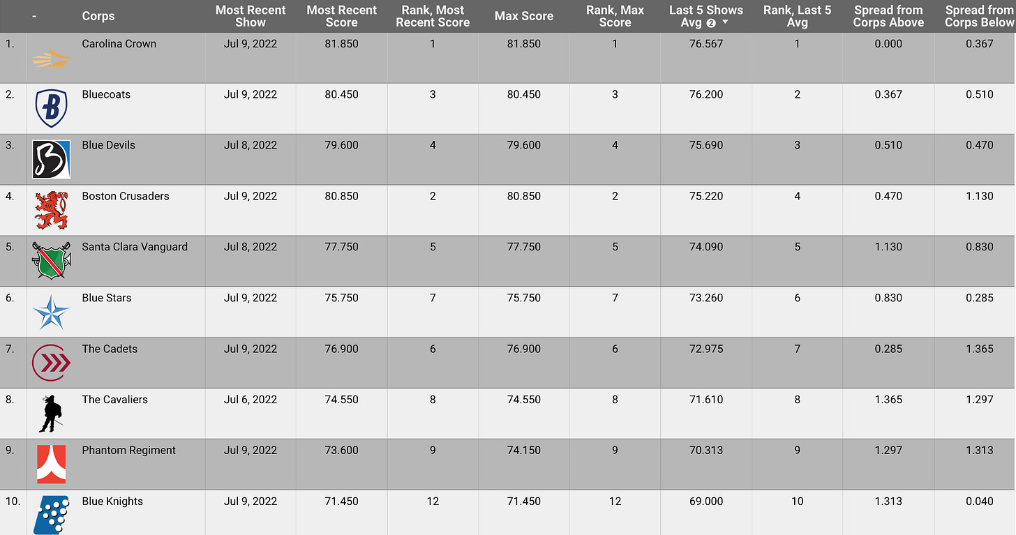 Wednesday was one of the busier slates of the week with three shows in Delaware, Ohio, and Iowa. The biggest highlight of the night goes to the Boston Crusaders who finished with a 78.15 in Delaware and shot up to the top of the leaderboard for the first time all season. BAC has been enjoying success in large part due to their percussion section who scored a 16.0 at the show, becoming the first caption of any corps in the 2022 season to place in Box 4 territory.