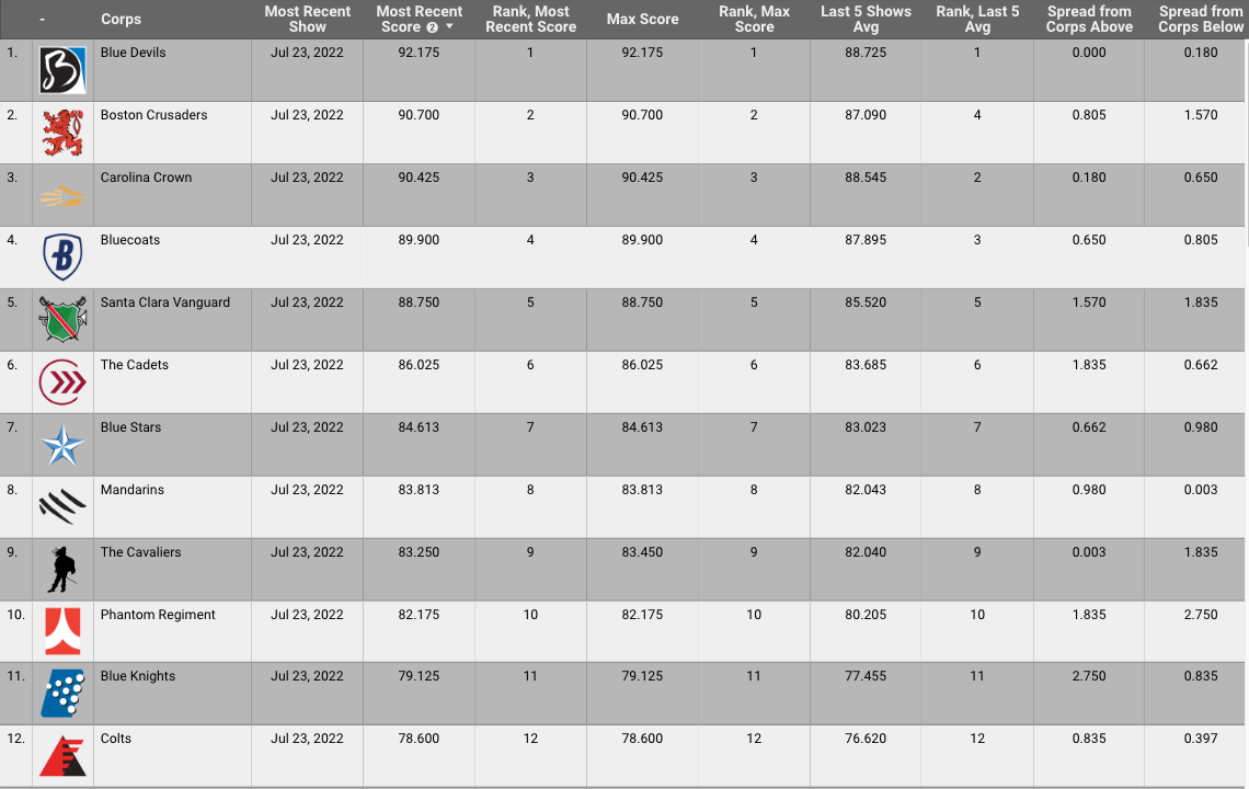 Santa Clara Vanguard has been sitting comfortably in the fifth spot this season and maintained that position last night. Vanguard did close the gap between them and Bluecoats, perhaps after benefiting from the favorable performance spot. SCV’s percussion section has been on fire again this year and finished first place in the caption by a tenth over second place Boston Crusaders. It remains to be seen if Vanguard has the gas to move up into the top 4 discussion, but for the moment, they will be pleased knowing that they will likely end up in a top 5 spot for the ninth straight season.