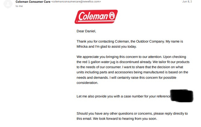 Yeah. Two colors only: Deep Ocean and Fog. Fancy names, but don't kid yourselves. The two colors are Blue and Sadder Blue. This was unacceptable!!! When the wall pushes, you push back!!! It was time to bust out the whoopin’ stick!!! Time for…a nicely worded email!!! I asked why the one-gallon water jug was not available in red. This was the response I received: